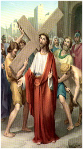Jesus recebe sobre seus ombros a cruz e se dirige ao monte Calvário ou Gólgota, onde será crucificado. A cruz era um antigo instrumento de suplício, usado para executar os condenados à morte.